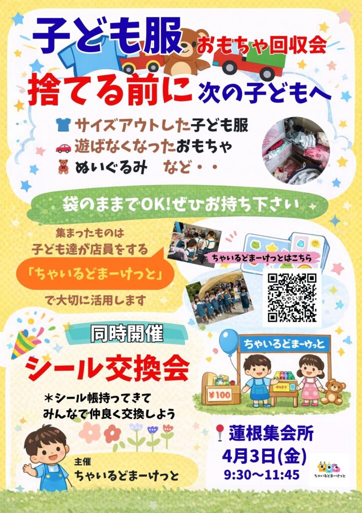 子どもたちが店員となってリユース品(サイズアウトした服やおもちゃなど)を販売する、体験型のフリーマーケットイベントです。